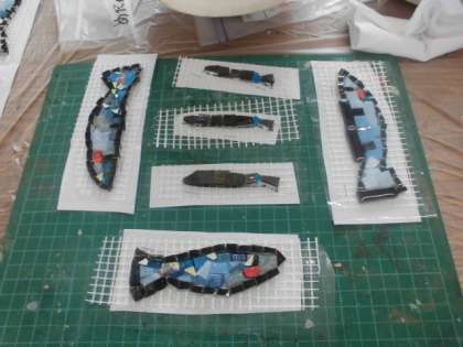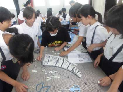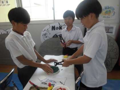 5年生は、中庭にあるキラキラ池を作ります。橋やメダカ、トンボなどをそれぞれに作りました。いろいろな工夫が見られました。タイルを割るのも楽しみながら取り組んでいました。