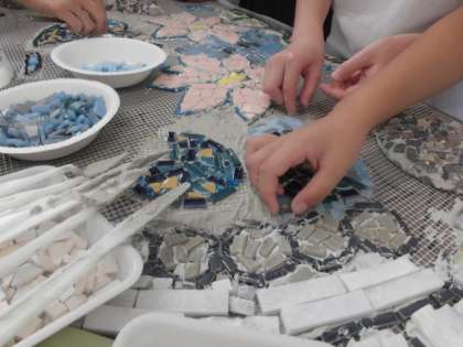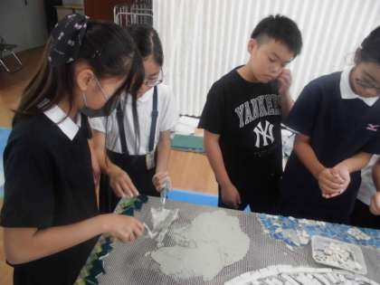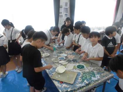 厚みをつけたり、いろいろな色のタイルのかけらを組み合わせて模様を作ったりしてどんどん作品が完成に近づいてきました。