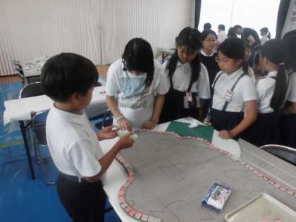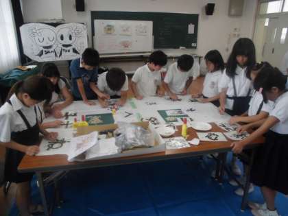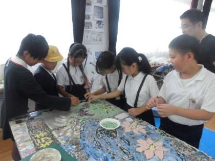文字作りと並行して桜の木のワク作りに取り組みました。桜の木のワクは、きれいな四角いタイルで作りました。わずかな間隔をあけてきれいに並べました。