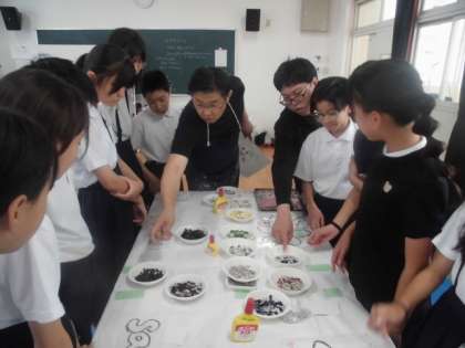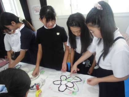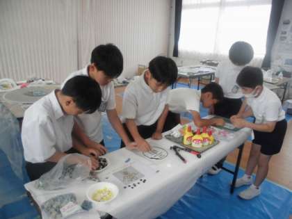 いよいよモザイクアート制作最終日です。6年生が三東キャラクター作りに取り組みますが、まずはパーツ作りからです。