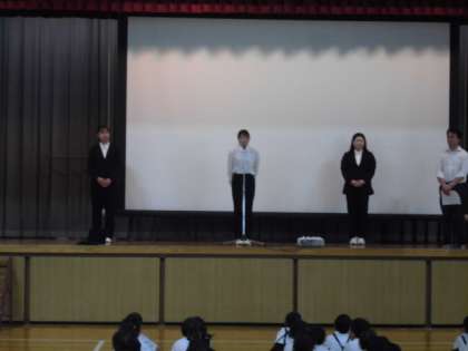 今日から三軒家東小学校に、3名の教育実習生が来ました。3人とも本校の卒業生です。全校児童の前で少し緊張気味でしたが、しっかりとあいさつをしました。