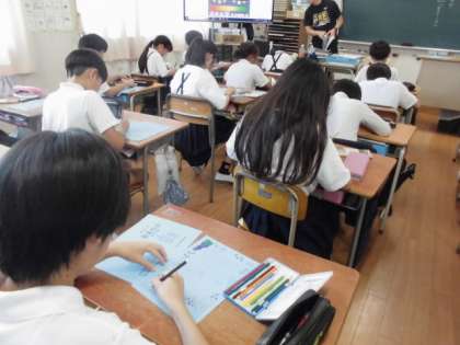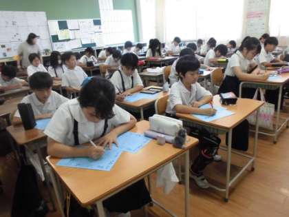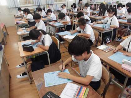 全校児童が、敬老の日に渡す手紙を書いています。心を込めて一生懸命に書いていました。