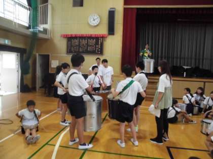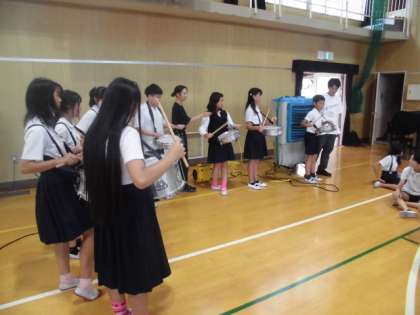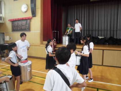 5,6年生が講師の先生をお迎えして、ブラジル楽器体験を行いました。初めに6年生が楽器を借りて、5年生がガンザを演奏しました。初めて使う楽器にとても集中して取り組んでいました。