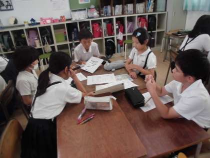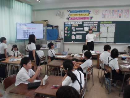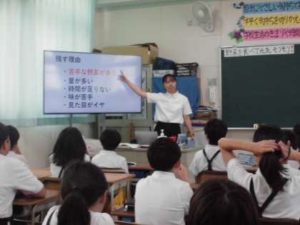 4年生が、教育実習の先生の指導で「野菜を食べて元気モリモリ!」の学習をしました。今よりもっと野菜を食べるための工夫について考え、班のみんなでより良い方法を考え、それぞれに発表をしました。みんなでしっかりと考えを深めることができました。