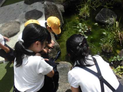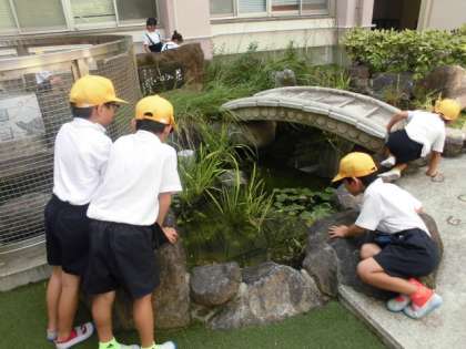 休み時間に、キラキラ池を観察している1年生の子が、2年生の子に「エビがいるよ」と教えていました。また、他の1年生は、「キリギリスの鳴き声が聞こえるよ」と教えていました。1年生の子たちはいろいろな生き物を見つけていました。