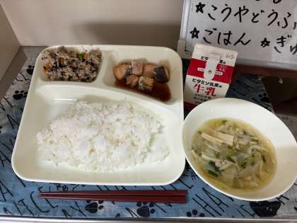今日の給食は、「さけのしょうゆだれかけ」「五目汁」「高野どうふのいり煮」「ごはん」「牛乳」でした。