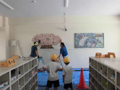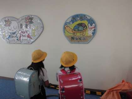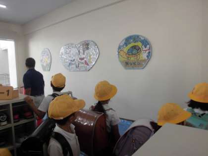 みんなで作ったモザイクアートをピロティーに設置してもらいました。下校の時間に完成していたので、初めて見る子たちからは歓声が上がっていました。