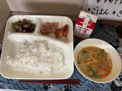 今日の給食は、「鶏肉のてり焼き」「とうがんのみそ汁」「なすのそぼろいため」「ごはん」「牛乳」でした。