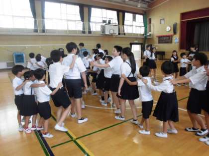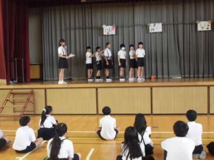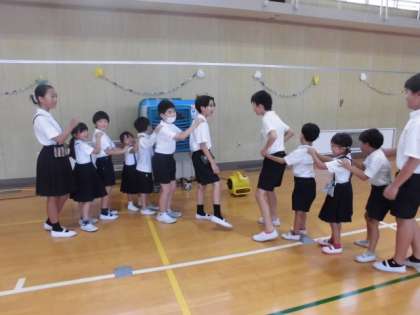 1年生と6年生で、1・6ハッピー集会を行いました。1学期の続きで「じゃんけん列車で学校クイズ」をしました。じゃんけん列車の先頭の人がクイズに答えて、間違えたら後ろにつながり、どちらも正解か不正解のときはじゃんけんで勝負を決めました。とても盛り上がりました。