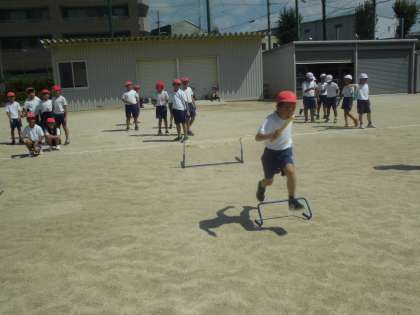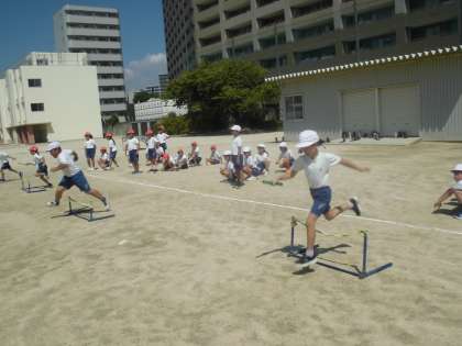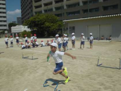 3年生が体育でハードルの学習をしました。歩数を合わせて走れるように取り組んでいました。