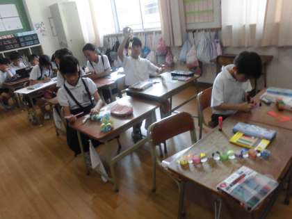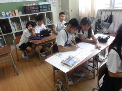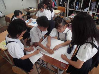 お店めぐりの2回目の準備がありました。どの班も協力して看板やかざり作りなどに取り組んでいました。たてわり班のメンバーもどんどん仲良くなってきました。