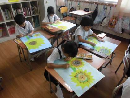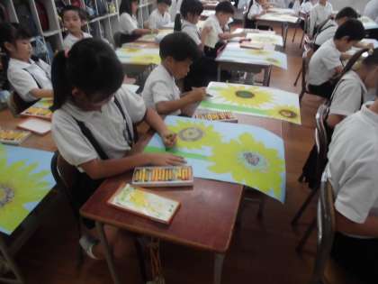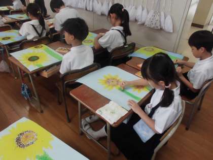 1年生が図工でひまわりの絵を描きました。クレパスでしっかり塗り込んで力強い元気なひまわりを描いています。