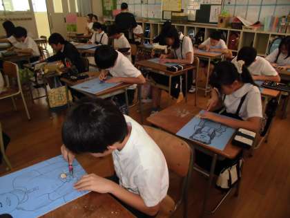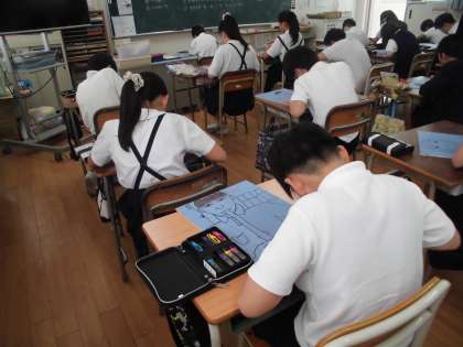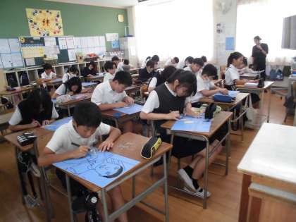 6年生が図工で版画に取り組んでいます。自分を描いて彫刻刀で掘っています。いろいろと彫り方も工夫してがんばっています。
