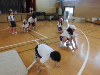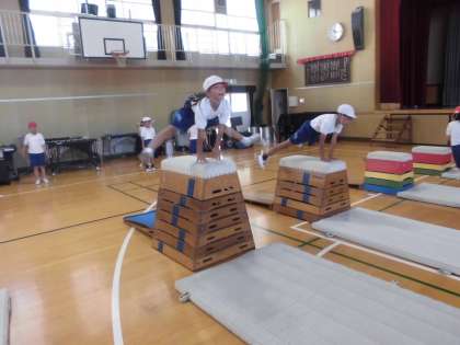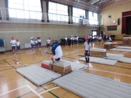 3年生が体育でとび箱の学習をしました。開脚とびや台上前転をしました。うさぎ跳びにも取り組み、台にしっかり手をついて押す練習をしました。粘り強く取り組むことで、跳べなかった段が少しずつ飛べるようになっていました。
