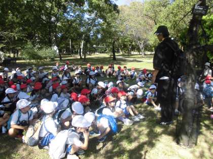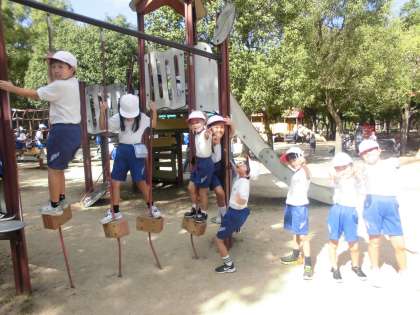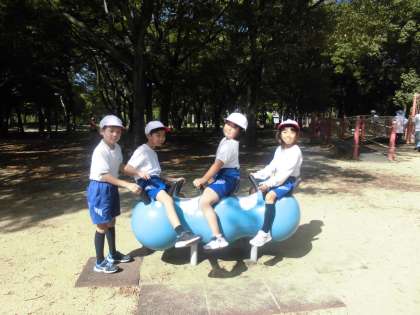 1,2年生が秋の遠足で大仙公園に行きました。2年生は、まず遊具で遊びました。とても楽しい遊具がたくさんありました。
