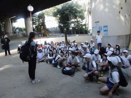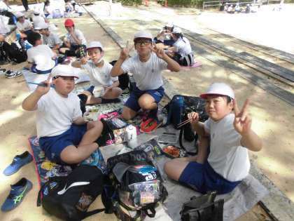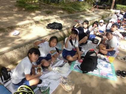 少し曇っていたおかげで、暑すぎることもなくさわやかな風も吹く中で、みんなで楽しくお弁当を食べました。そして、お弁当を食べた後は、迫力満点のすべり台のある広場に移動しました。