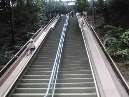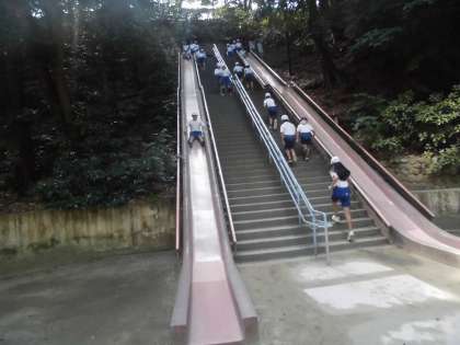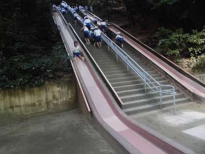 とてもスピードが出る上に途中で少しお尻が浮き上がるスリル満点のすべり台のある広場に移動してきました。先生の説明が終わると、先を競ってすべり台に向かって行きました。何回もすべって思う存分楽しんでいました。