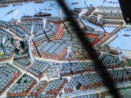 昔の大阪の地図で三軒家地区を探し、みんなで三軒家東小学校の周りに何があったか調べていました。