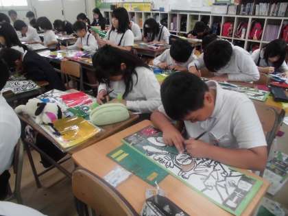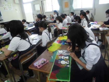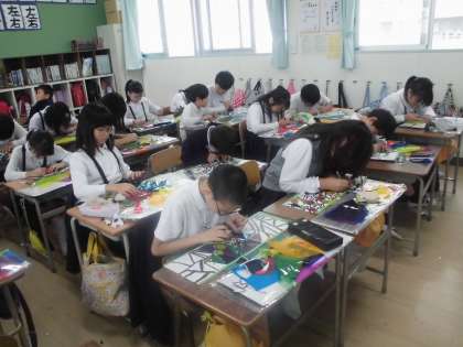 4年生が図工で、ステンドボックスを作っています。カッターで切ったところにセロファンを貼ってステンドグラスの模様のような箱を作ります。みんないろいろな工夫をしながら一人一人の思いのこもったの作品を作っていました。