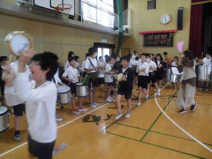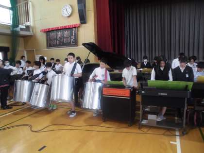 5,6年生が、三東おめでとう150周年集会とブラジルデイに向けて合奏の練習をしています。今日は、打楽器が移動しながら演奏する練習もしました。どんどんみんなの心も一つになって練習が進んでいます。