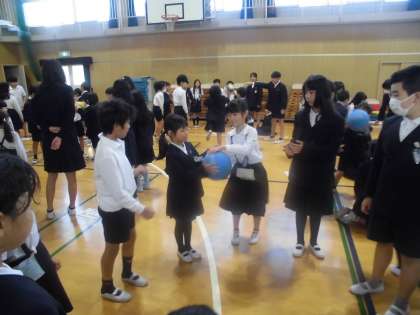 児童集会でばくだんゲームをしました。たてわり班のみんなでドキドキしながら楽しく遊びました。