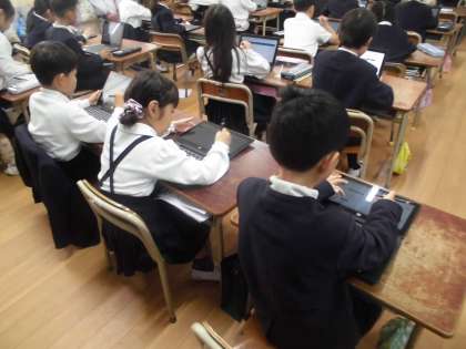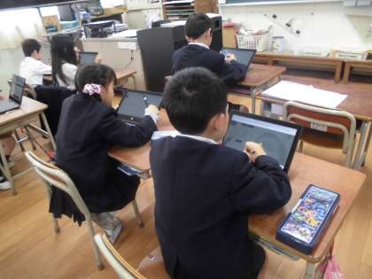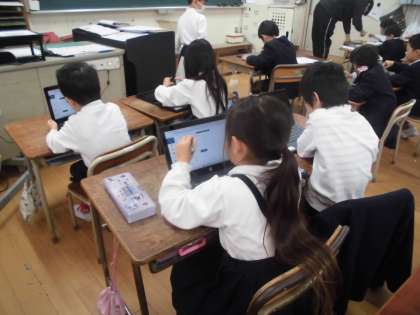 1年生がデジタルドリルで国語の学習に取り組んでいます。6年生に教えてもらってから自分たちで使いこなせるようになりました。意欲的にどんどん取り組んで進めていました。