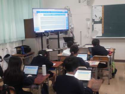 3年生は、スライドを見たり、発表ノートで自分の考えを書いたりしながら防災学習に取り組みました。