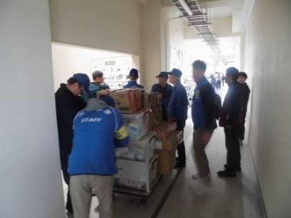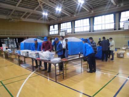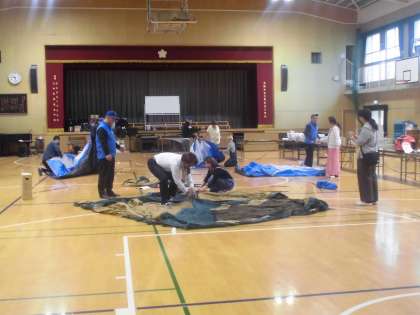 地域の皆様が、防災学習のために、3階の備蓄倉庫から講堂に倉庫の中にあるものを運んでいただき、見学しました。テントなども実際に組み立てていただきました。