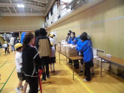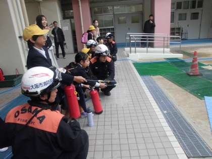見学の後は、地域の方が炊いていただいたアルファ化米のわかめご飯を配っていただきました。そして、雨にもかかわらず来ていただいた大正消防署の方からは、消火器の消化体験をさせていただきました。