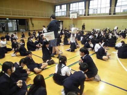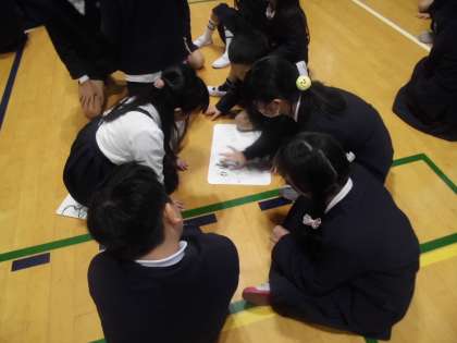 児童集会で、先生まちがいさがしをしました。たてわり班で話し合って答えを出しました。みんなで楽しく活動しました。