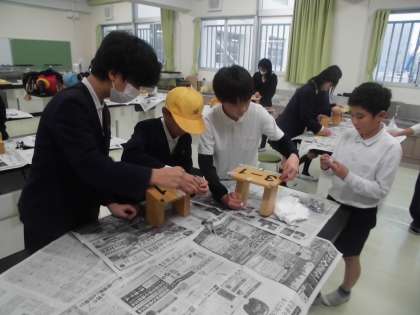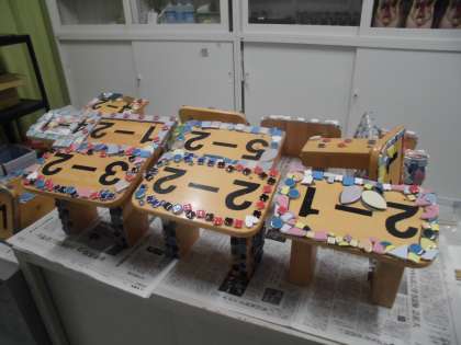 モザイクアートで岡田さんと橋本さんに教えてもらったことを生かして、6年生の有志のメンバーがPTAの方の協力で下駄箱の学年表示板にかざりつけをしました。それぞれにいろいろな工夫をしてかざりつけをしました。