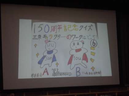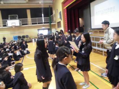 図書委員会が、児童朝会で周年行事に向けて行ったクイズラリーの答え合わせをしました。さらに読書週間でたくさん本を読んだ人にしおりを渡しました。クラスの代表がもらいました。みんな喜んでいました。