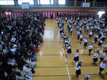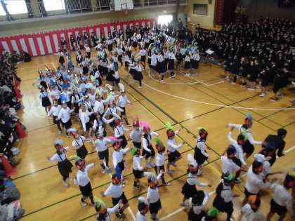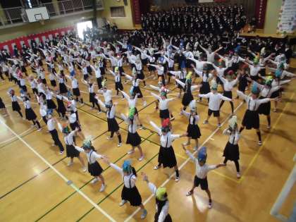 歌と合奏の途中からダンスが入ってきました。ダンスが入ってきて歌、ダンス、合奏がそろうととても迫力がありました。全校児童の心が一つになりました。