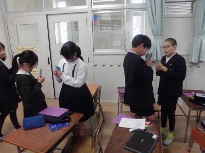 4年生が外国語活動で、3枚の食べ物カードを使ってオリジナルメニューを作る学習をしました。まずは、もらった3枚のカードを交換して、最後に残ったカードでオリジナルメニューを考えました。次の時間にできたメニューの発表をします。