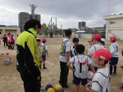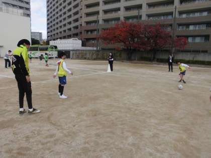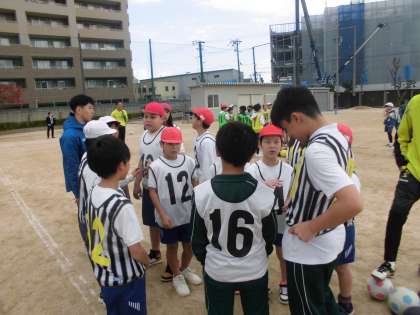 サッカーの試合が終わるごとに、チームごとで反省会をしました。アレグリア校の子たちはポルトガル語を話すので、身振り手振りで交流しました。なかなか伝わらないところをラモスさんが通訳してくれる場面もありました。また、ラモスさんからアドバイスをしてもらったり、試合の合間にボールのけり方を指導してもらったりしました。とても貴重な体験となりました。
