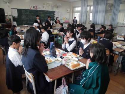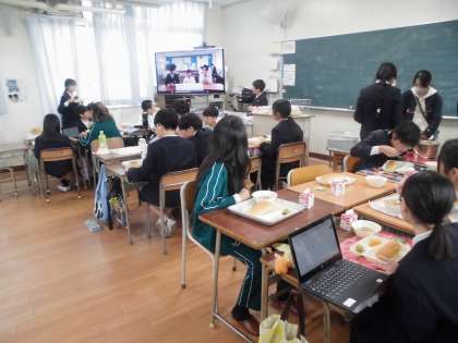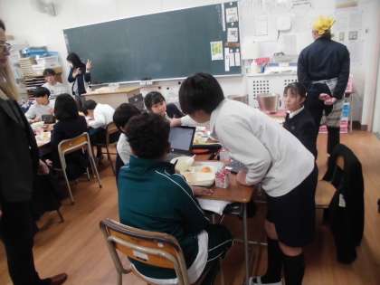 カルタとサッカーの交流の後、5,6年生は給食交流を行いました。タブレットの翻訳機能を使って交流したり、アレグリア校の子たちに見てもらうために作った動画を見てもらったりしました。楽しい交流の時間となりました。