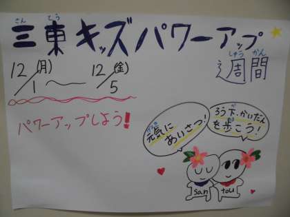 12月1日〜5日までは、「三東キッズパワーアップ週間」です。児童会が、朝のあいさつ運動や廊下・階段の右側を正しく歩くために様々な取り組みをしています。
