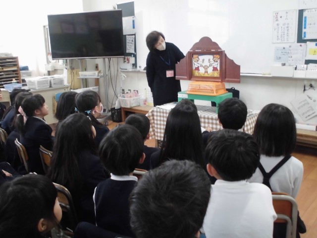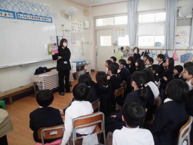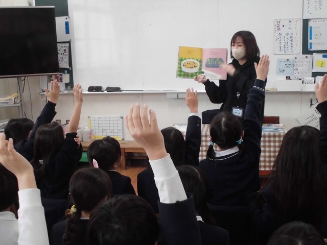 2年生が読み聞かせをしてもらいました。言葉を並び替える絵本では、みんな一生懸命頑張って考えて答えていました。