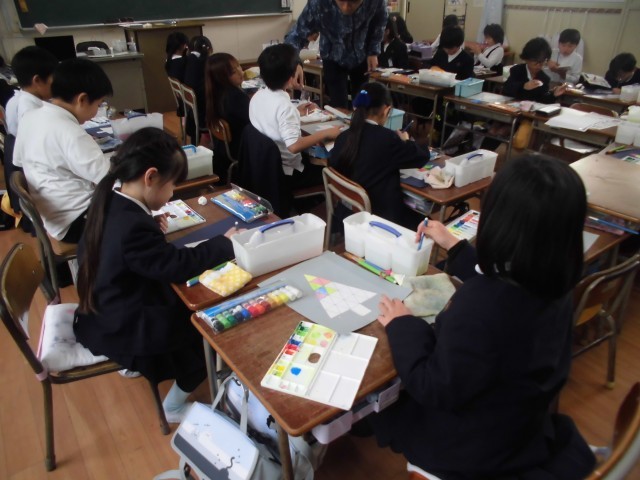 2年生が、図画工作で絵の具を使ってクリスマスツリーの絵を描きました。三角形のわくの中を一つ一つ色のバランスを考えて丁寧にぬっていました。