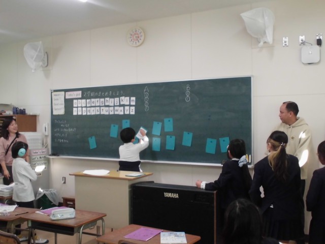 4年生が外国語活動の2学期のまとめをしました。黒板で神経衰弱をして当たったら、そのカードの発音をみんなで確かめたり、班でクイズに答えたりして楽しく学習しました。