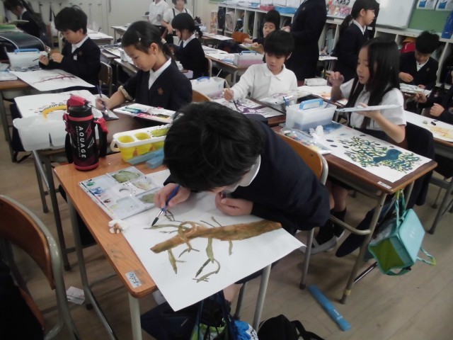 3年生が、図画工作でモチモチの木を描きました。モチモチの木は国語で学習している教材です。みんな想像していろいろなモチモチの木を描いていました。