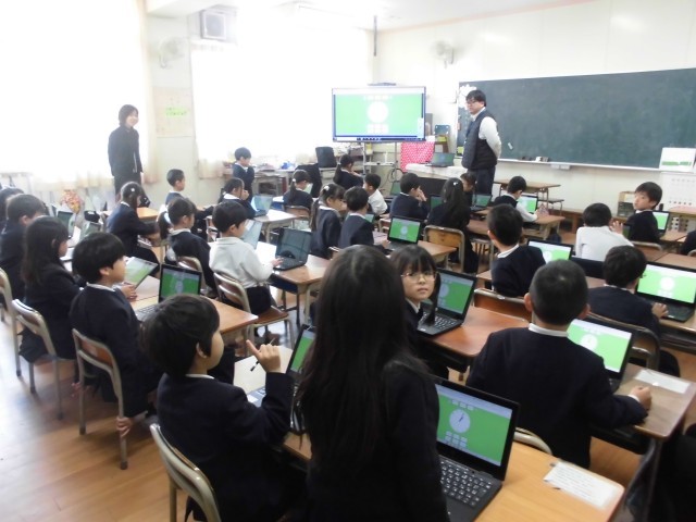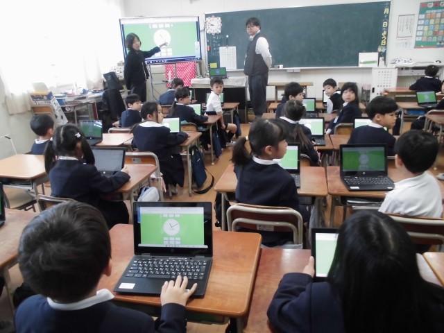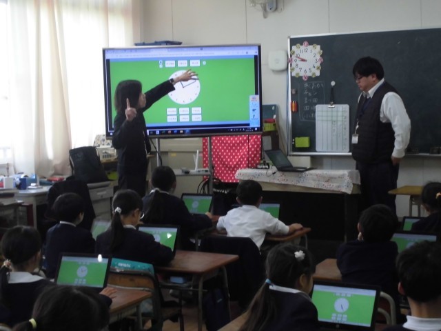 1年生が、算数で時計の学習をしました。今回は、タブレットを使って問題を出し合ったり、実際に時間を合わせたりする学習をしました。この前教えてもらったところですが、どんどんタブレットを使いこなせるようになってきています。