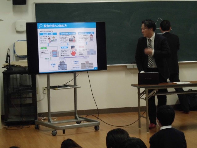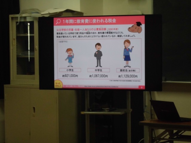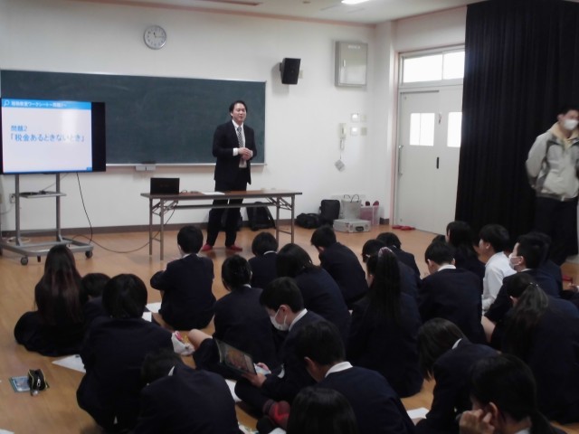 6年生がゲストティーチャーをお迎えして租税教室をしました。初めに動画を見てその後に、もし税金がなかった場合にどんなことが起こるか考えました。税金の使い道を知ることで、税金の大切さについてじっくり考えていました。自分たちが1年間学校に通って勉強するのに、一人当たり1000万円近くかかっており、三軒家東小学校全体で計算すると、40億円近くかかっているということにみんな驚いていました。最後に1億円のお札の束の見本を見せてもらい、重さを実感していました。
