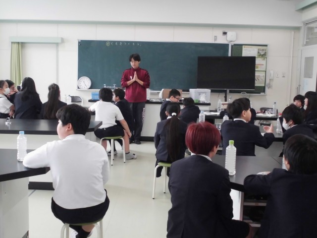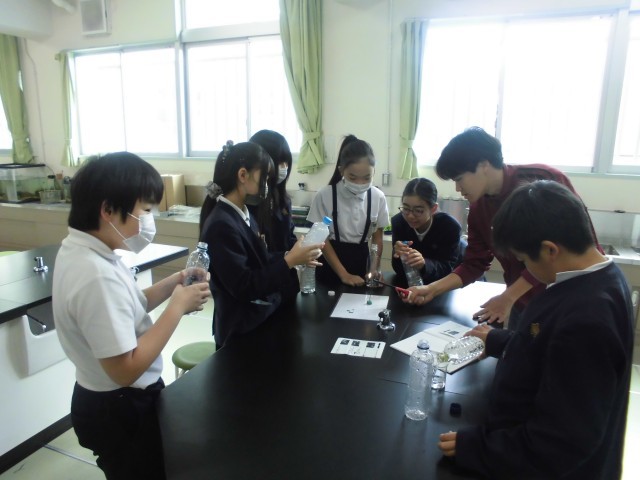 5年生が、4年生の学習の復習と天気の学習の発展としてペットボトルで雲を作る学習をしました。ペットボトルにぬるま湯を入れて線香の煙を入れて振ります。その後ぎゅっとペットボトルをへこませると、ペットボトルの中に雲が現れます。みんなで協力して楽しく実験をすることができました。