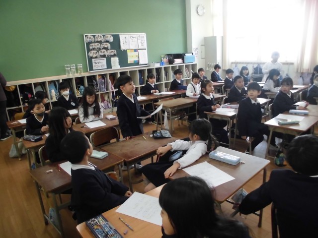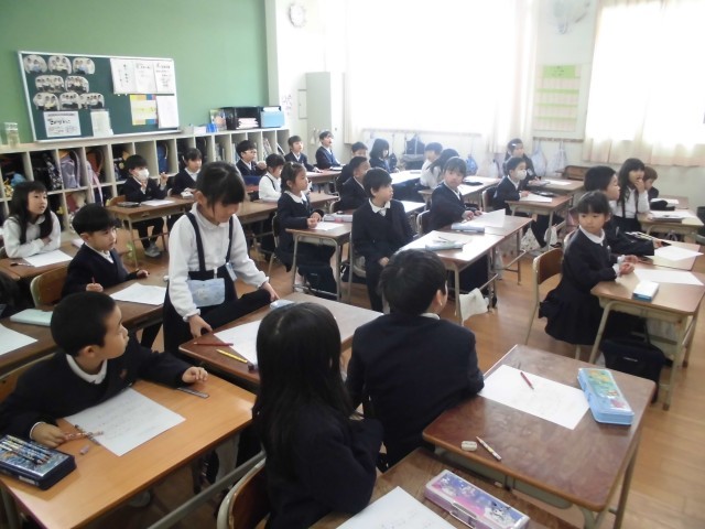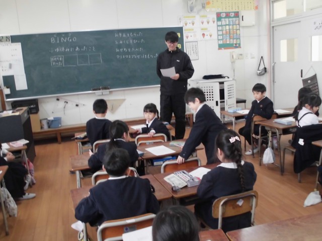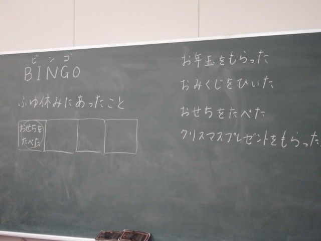 1年生が学級活動で「冬休みビンゴ」をしました。おもちを食べた、たこあげをしたなどをビンゴにしてみんなでお正月を振り返りました。お正月に自分と同じことをしていた友達と笑顔で話していました。