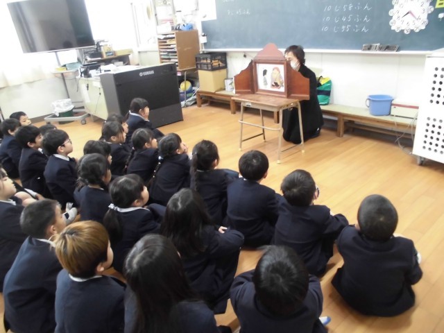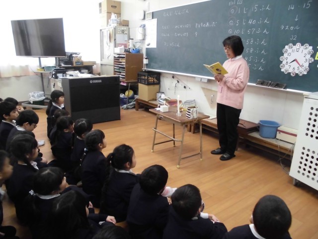 1年生が、「ひまわりの会」の方をお迎えしてお話会をしました。紙芝居を読んでもらったり、鳥の人形を使ったお話をしてもらったりして楽しくお話を聞かせていただきました。お話のろうそくもつけてもらい、消すときにはみんなで願い事をしました。