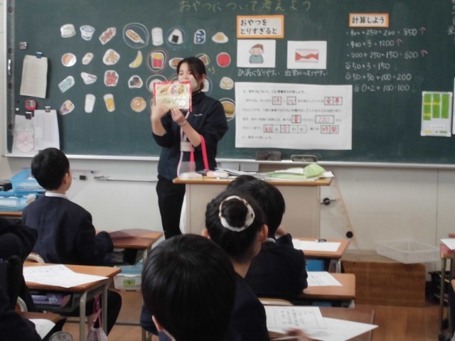 5年生が、食に関する指導でおやつについて考えました。おやつは1日kcalカロリーぐらいが目安ですが食べたいと選んだおやつはすごい摂取カロリーとなっていました。おやつについてしっかりと考える機会となりました。