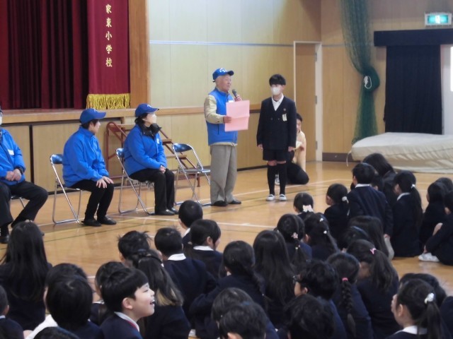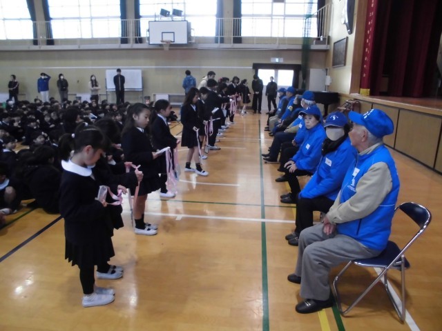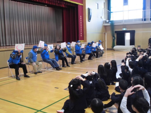 見守り隊のみなさんをお迎えして「ありがとう集会」を行いました。初めに見守り隊の方に自己紹介をしていただき、その後は見守り隊の方へのアンケートを行いました。続いて〇✖クイズをしました。子どもたちは、これらの活動を通して見守り隊の方のことを知ったり、どんな思いで見守り隊をやっていただけているのかを知ることができました。そして、感謝の気持ちを伝えるために各クラスで作ったお守りメダルを渡しました。集会でしっかりと感謝の気持ちを伝えることができました。集会後は、図工室でPTAからも子どもたちの安全を見守っていただいている皆さんの気持ちを伝えるためにお礼の会を開きました。三軒家東小学校ではPTAと地域がしっかりと連携して子供たちの安全を守っていただいています。