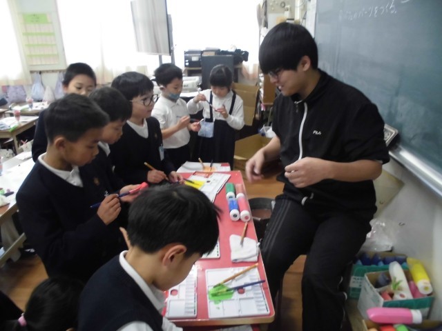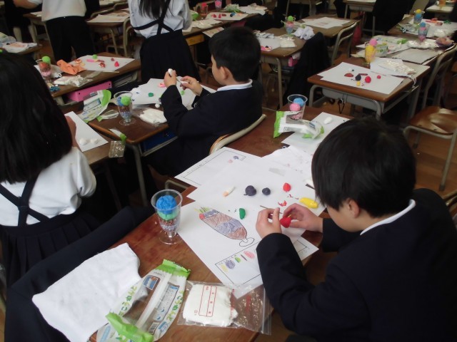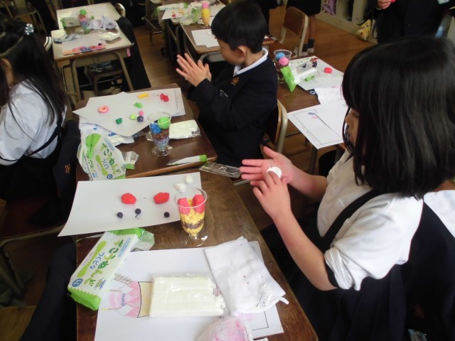 1年生が、図画工作で「すてきなパフェ」を作りました。みんなおいしそうな果物を作っていました。もうすぐ完成します。