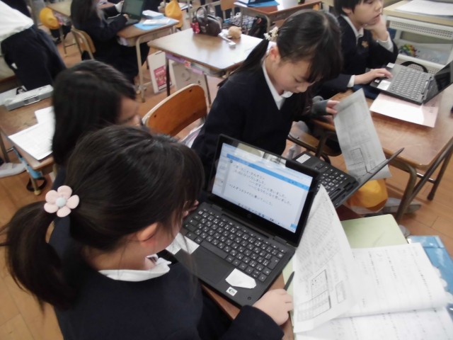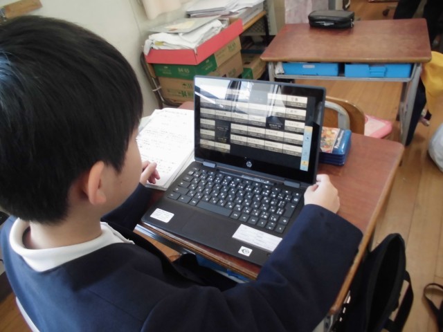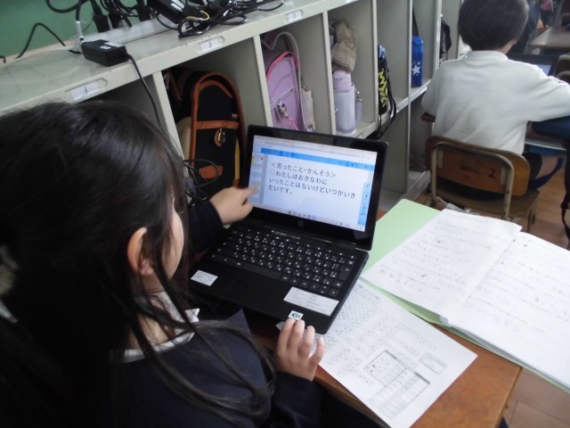 2年生が校区たんけんのまとめをしました。タブレットの発表ノートを使ってまとめ、友達の発表と比べていました。タイピングがまだできない子はローマ字表を見ながらがんばっていました。